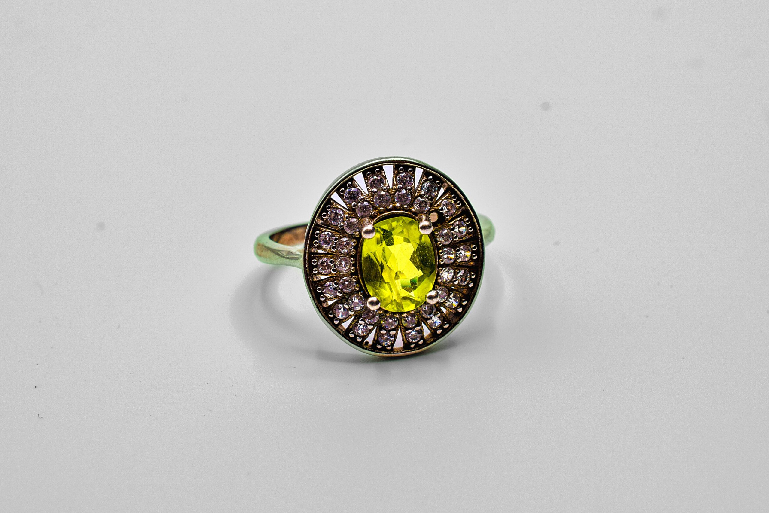 - Gemstones: Oval green peridot (or green zircon) center stone + white cubic zirconia halo.