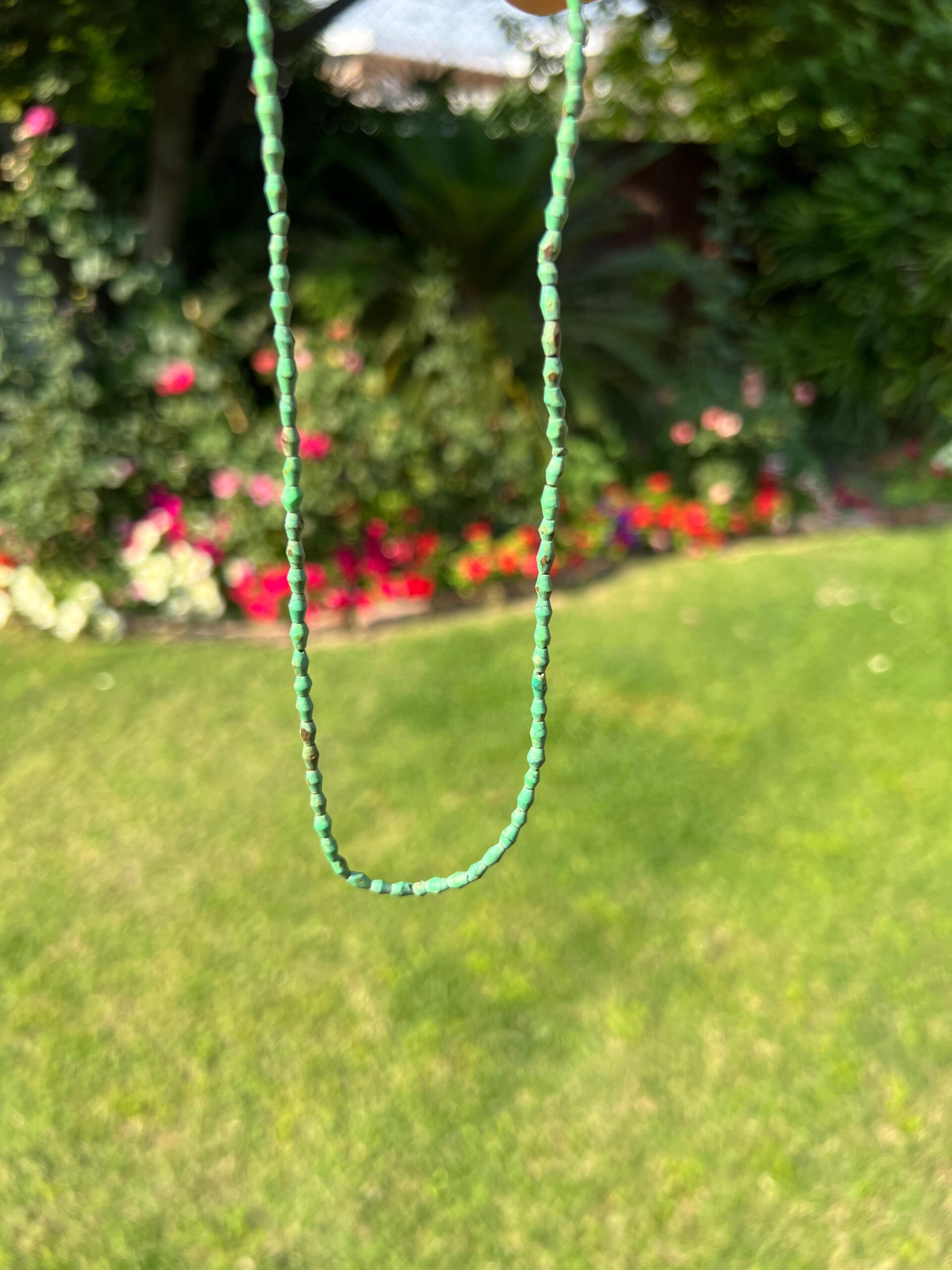 A deeply spiritual and vibrant necklace featuring authentic Nepali Feroza, a variety of turquoise cherished across the Himalayas for its protective and healing energies. Unlike the solid blue of Persian varieties, Nepali Feroza is celebrated for its organic character, featuring a beautiful interplay of sky-blue and sea-green hues woven together by natural dark matrix veining. Each bead is a testament to the raw, ancient beauty of the earth.